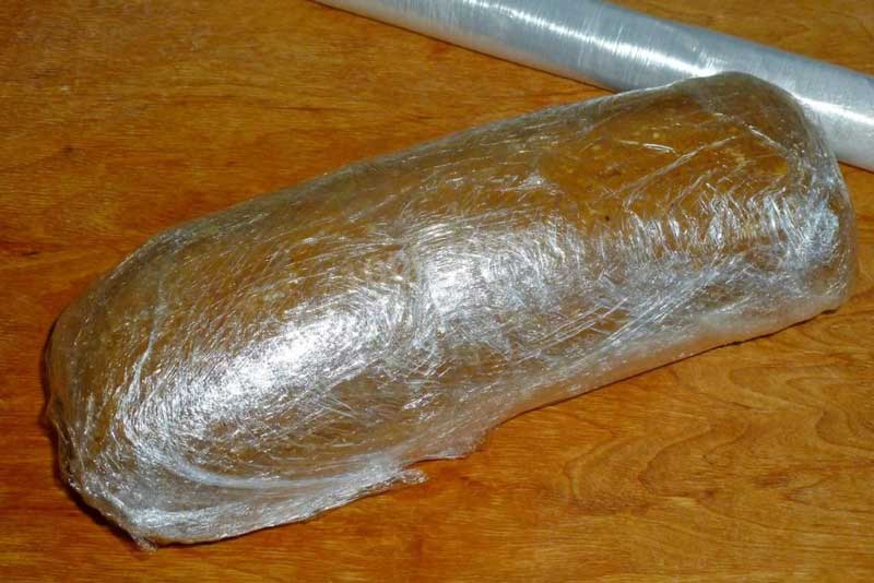 Pasul 7: fixăm cârnatul înfășurându-l strâns în folie alimentară, atât pe lungime cât și pe lățime.