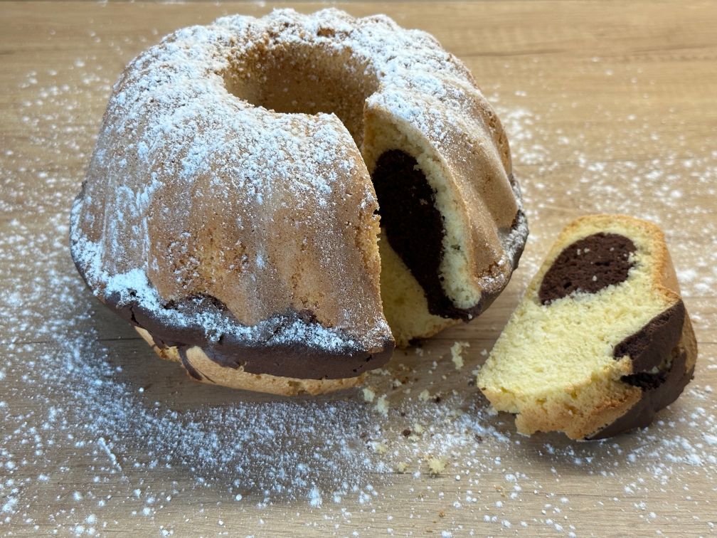 3 Turnăm 2/3 din compoziție într-o formă de chec rotunda (guguluf) unsă. În restul compoziției adăugăm cacao, amestecăm și turnăm peste primul strat. Coacem la 180 de grade timp de aproximativ 45 – 60 de minute.