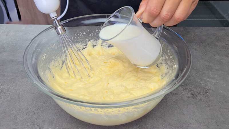 Luăm 1 lingură de făină din 350 g pentru mai târziu, restul o introducem în 2 etape în compoziția de unt. Amestecăm bine. Al doilea principiu este consistența aluatului; aluatul pentru chec trebuie să fie ca o cremă de tort – nu curge de pe tel, dar nici nu este gros.