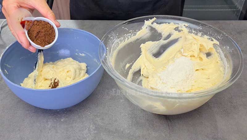 Împărțim aluatul aproximativ în mod egal, într-o parte adăugăm făina (lingura de mai devreme), în cealaltă un praf bun de cacao (10 g). Amestecăm mai întâi aluatul alb, apoi cel negru, pentru a nu spăla telul, dacă ar fi invers.