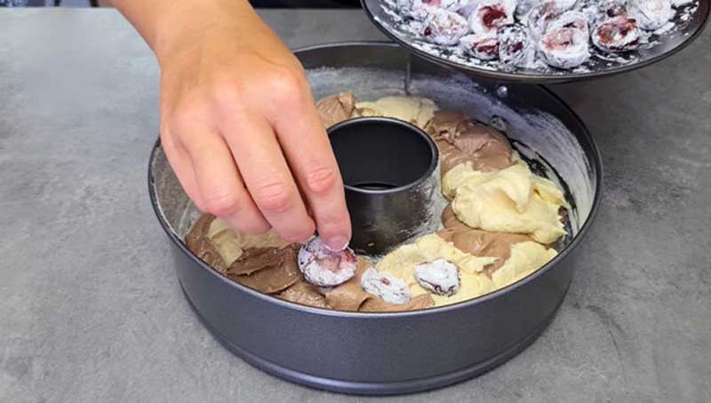Folosim o formă cu inel pentru a obține al treilea principiu al prăjiturii reușite – astfel mijlocul nu va rămâne crud (mai ales dacă forma, ca a mea, are 26 cm în diametru). Forma este unsă cu unt și presărată cu făină. Umplem forma haotic cu aluat, putem pune cu lingura sau să tragem linii cu o scobitoare în interior pentru a obține un model în chec.