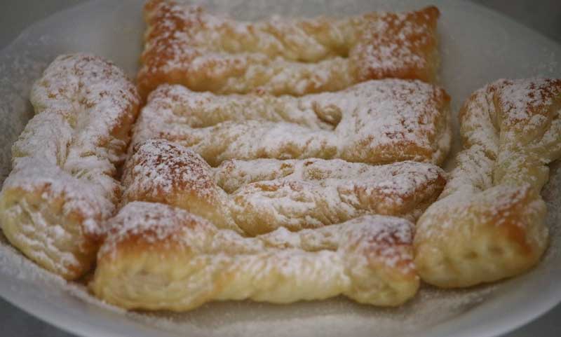 Împart aluatul foietaj, care măsoară aproximativ 40 cm x 25 cm, în trei dreptunghiuri, pe care le întind ușor pentru a le face mai subțiri. Cu un tăietor de aluat, tai benzi și fac o tăietură pe mijlocul fiecărei benzi (lungimea tăieturii ar trebui să fie de aproximativ 3-4 cm pentru a putea trece aluatul prin deschiderea respectivă).