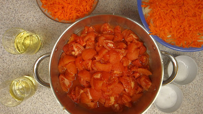 Tăiem ceapa în felii subțiri, iar roșiile le curățăm de coajă (pentru a le curăța mai ușor, le-am scufundat în apă clocotită timp de aproximativ 2 minute) și le tăiem în bucăți mici.