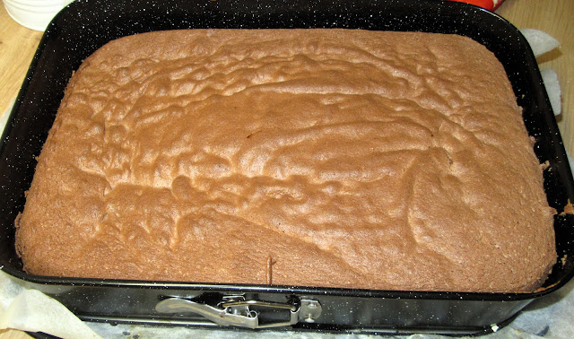 Batem albușurile spumă, adăugăm treptat zahărul, scădem viteza mixerului și adăugăm gălbenușurile. Cernem făina, praful de copt și cacaua – amestecăm ușor.
