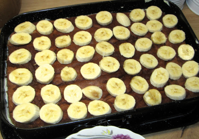 Așezăm felii de banane. Bananele se ung cu suc de lămâie pentru a nu se înnegri.