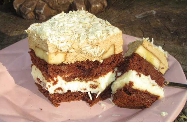 Dragii mei, vă invit la o nouă prăjitură delicioasă – de data aceasta cu cafea și banane, cu cremă fină. Este alcătuită dintr-un blat pufos cu cafea, cremă, banane și spumă de cafea. Totul este presărat cu ciocolată albă rasă.