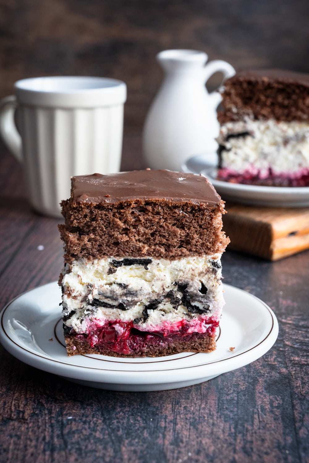 Biscuiții Oreo se înmoaie plăcut în crema de smântână, iar dulceața lor, alături de dulceața cremei, echilibrează perfect adăugarea de jeleu ușor acrișor din vișine congelate.