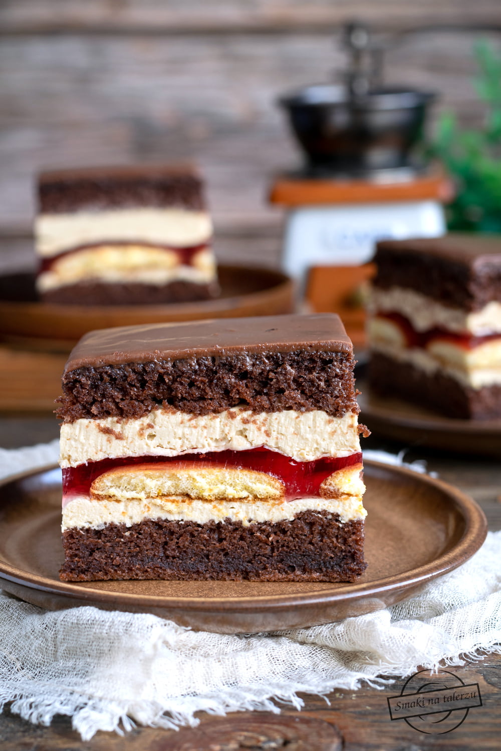 Această prăjitură cu blat de cacao, cremă fină de cafea și jeleu de cireșe este un desert spectaculos, cu straturi echilibrate atât ca textură, cât și ca gust. Blatul umed, preparat cu cafea tare și smântână, se combină perfect cu o cremă delicată de budincă și cafea de cereale, în timp ce stratul de pișcoturi și jeleu adaugă un contrast răcoritor și un efect vizual impresionant.