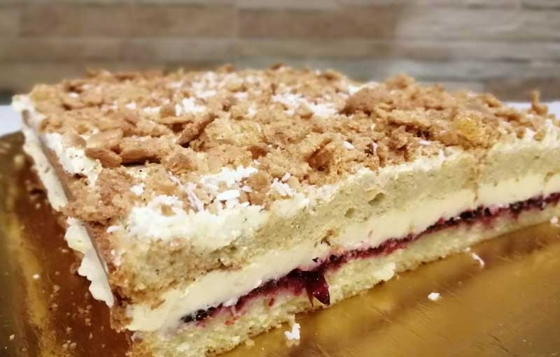 Această prăjitură cu pandișpan pufos, cremă fină cu aromă de vanilie și lichior Malibu și un strat delicios de gem de coacăze negre este perfectă pentru ocazii speciale sau pur și simplu pentru a-ți răsfăța familia într-o zi obișnuită. Fulgii de cocos și firimiturile de blat deasupra adaugă un decor simplu, dar spectaculos, cu un efect vizual rustic și apetisant.