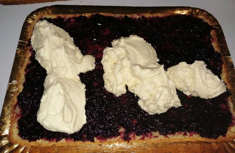 1. Primul blat de pandișpan + sirop + gem de coacăze