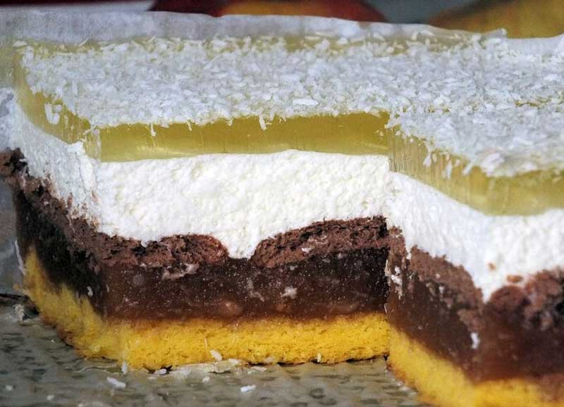 9. Dizolvăm gelatina cu aromă de lămâie în apă fierbinte, lăsăm să se răcească și să înceapă să se închege, apoi o turnăm peste stratul de cremă. Presărăm fulgii de cocos deasupra și punem prăjitura la rece până se întărește complet.