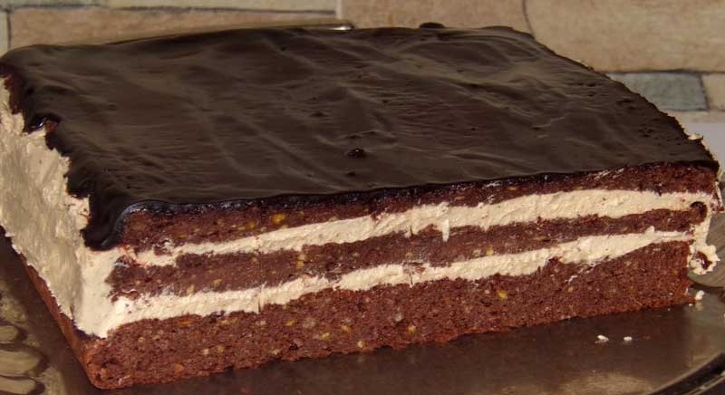 Desert cu portocale fierte, nuci, cremă de cafea și glazură de ciocolată