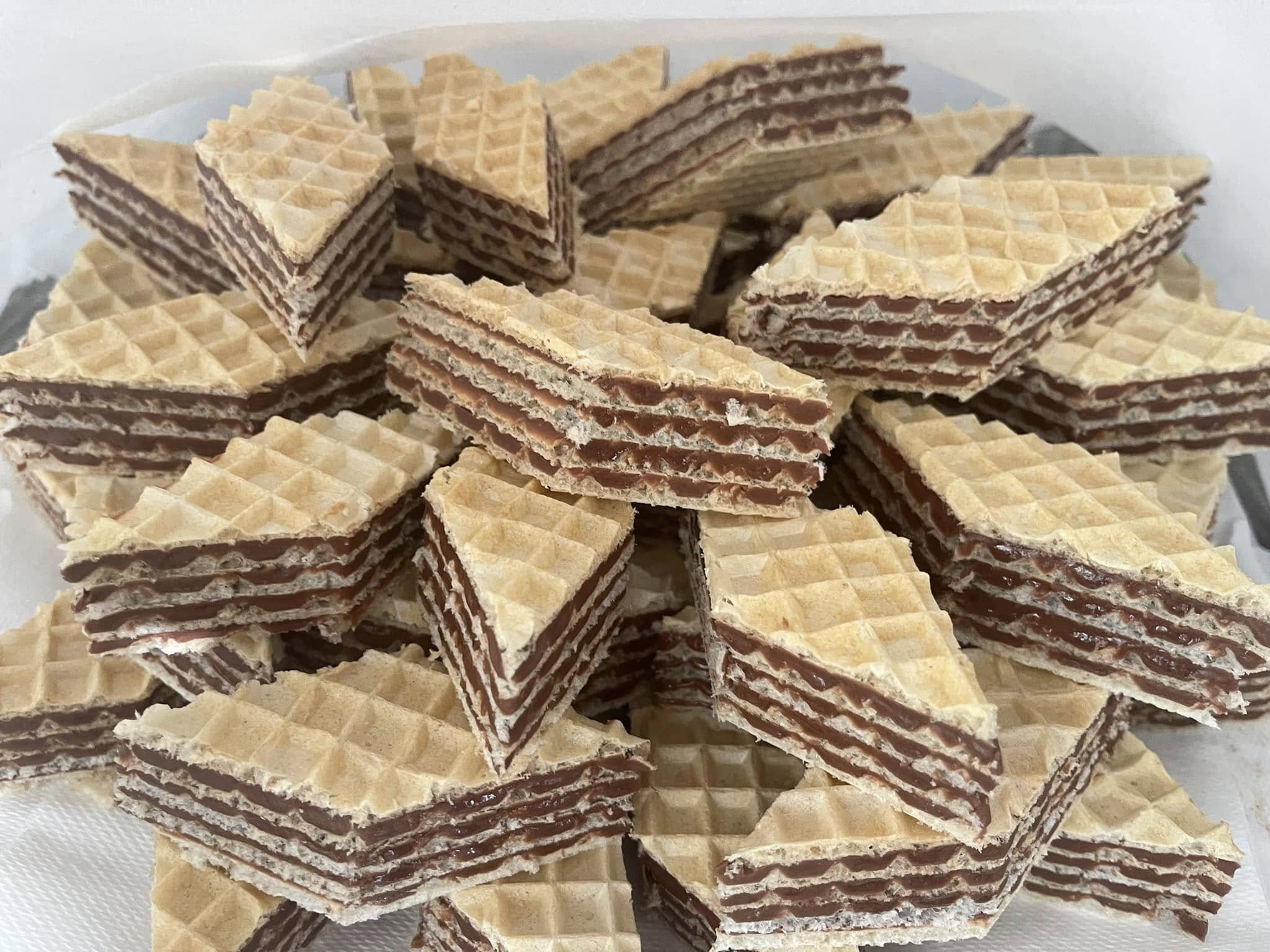 Tăiați foile de vafe în două părți, obținând 6 foi. Împărțiți crema de ciocolată în 5 părți egale și distribuiți-o uniform pe foile de vafe.