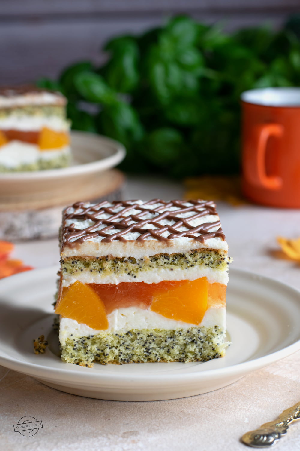 Prăjitura cu piersici este un blat cu mac, umplut cu cremă de vanilie preparată în casă și acoperit cu un strat de piersici în jeleu. Prăjitura este plăcut de dulce (pentru mine nu prea dulce) și aromata datorită fructelor în jeleu. Cu alte cuvinte, este minunată!