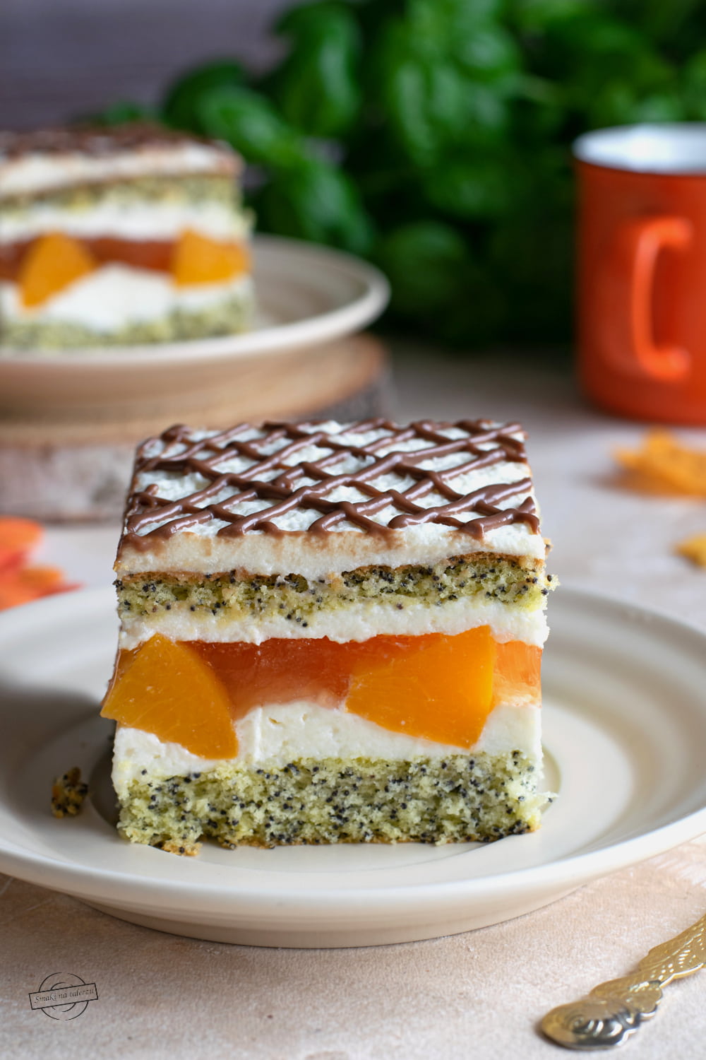 Prăjitura cu piersici este un blat cu mac, umplut cu cremă de vanilie preparată în casă și acoperit cu un strat de piersici în jeleu. Prăjitura este plăcut de dulce (pentru mine nu prea dulce) și aromata datorită fructelor în jeleu. Cu alte cuvinte, este minunată!
