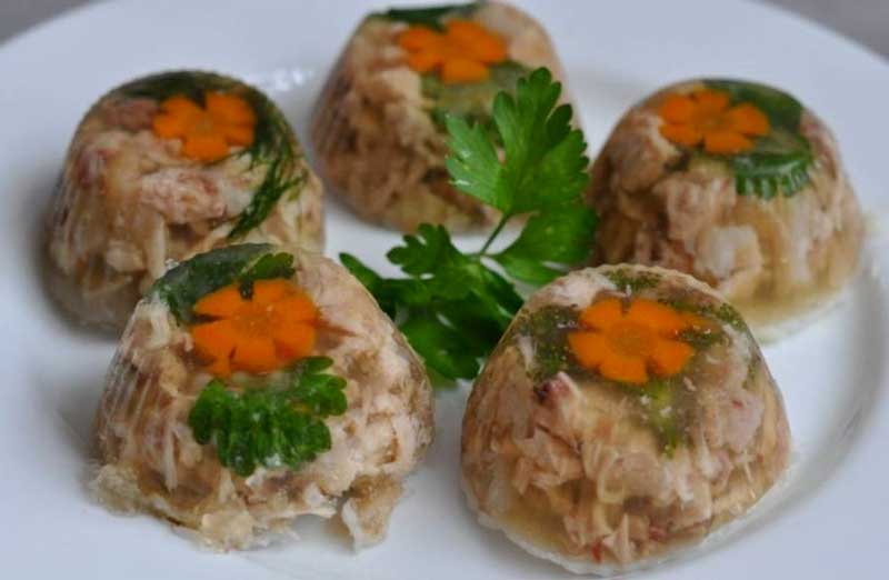 Scoatem toate oasele și cartilajele din picioarele de porc și pui. După fierberea îndelungată, carnea se desprinde imediat și nu e nicio dificultate să îndepărtați oasele. Nu aruncați pielița — tocați-o foarte mărunt și amestecați-o cu restul cărnii fierte și aromate: va ieși suculent și fraged.