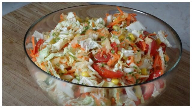 1. Pregătirea legumelor: Tăiați varza chinezească în fâșii subțiri. Curățați morcovul și dați-l pe răzătoare. Curățați mărul și dați-l și pe acesta pe răzătoare. Tăiați roșiile cherry în jumătăți. Scurgeți porumbul.