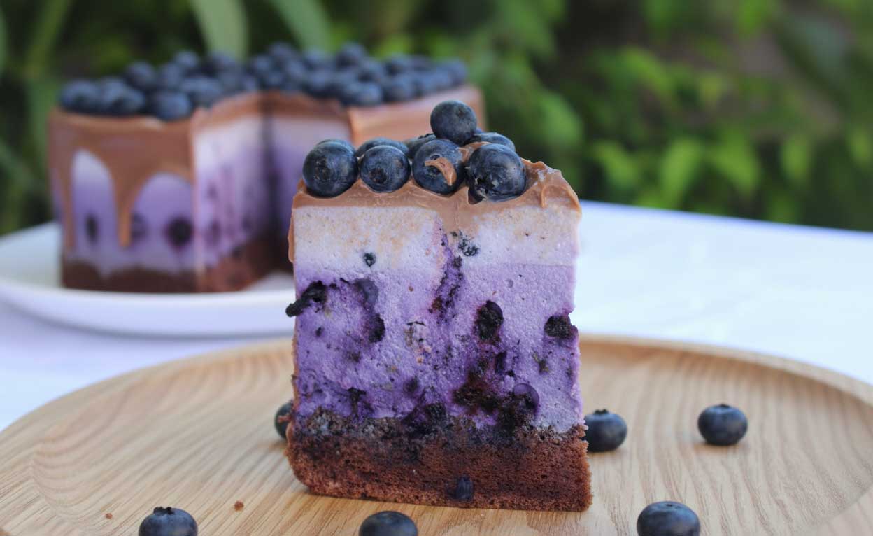 Acest tort spectaculos cu trei straturi de cremă colorate natural cu afine, blat ușor cu cacao și o glazură catifelată de ciocolată este un adevărat răsfăț vizual și gustativ. Texturile se îmbină perfect, iar fiecare felie arată ca un apus de vară prins între două straturi de frișcă.