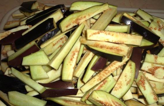 Pasul 1 Spălăm vinetele și le tăiem capetele. Apoi le feliem subțire.